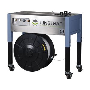 Halvautomatisk PREMIUM strapbåndsmaskine, til PP pallebånd 5-16mm bredde, kan allerede anvendes fra 0,4mm båndtykkelse, Ø200mm kerne (fås også i ø280 mm kerne), ca. 30 omgange/min., 2-40 kilo spændekraft, kan reguleres elektronisk. Mål: 845x430x750mm, indstillelig arbejdshøjde 750-830mm (LxBxH), ekstrem stille via kvalitets DC motorer, vægt 120 kilo.